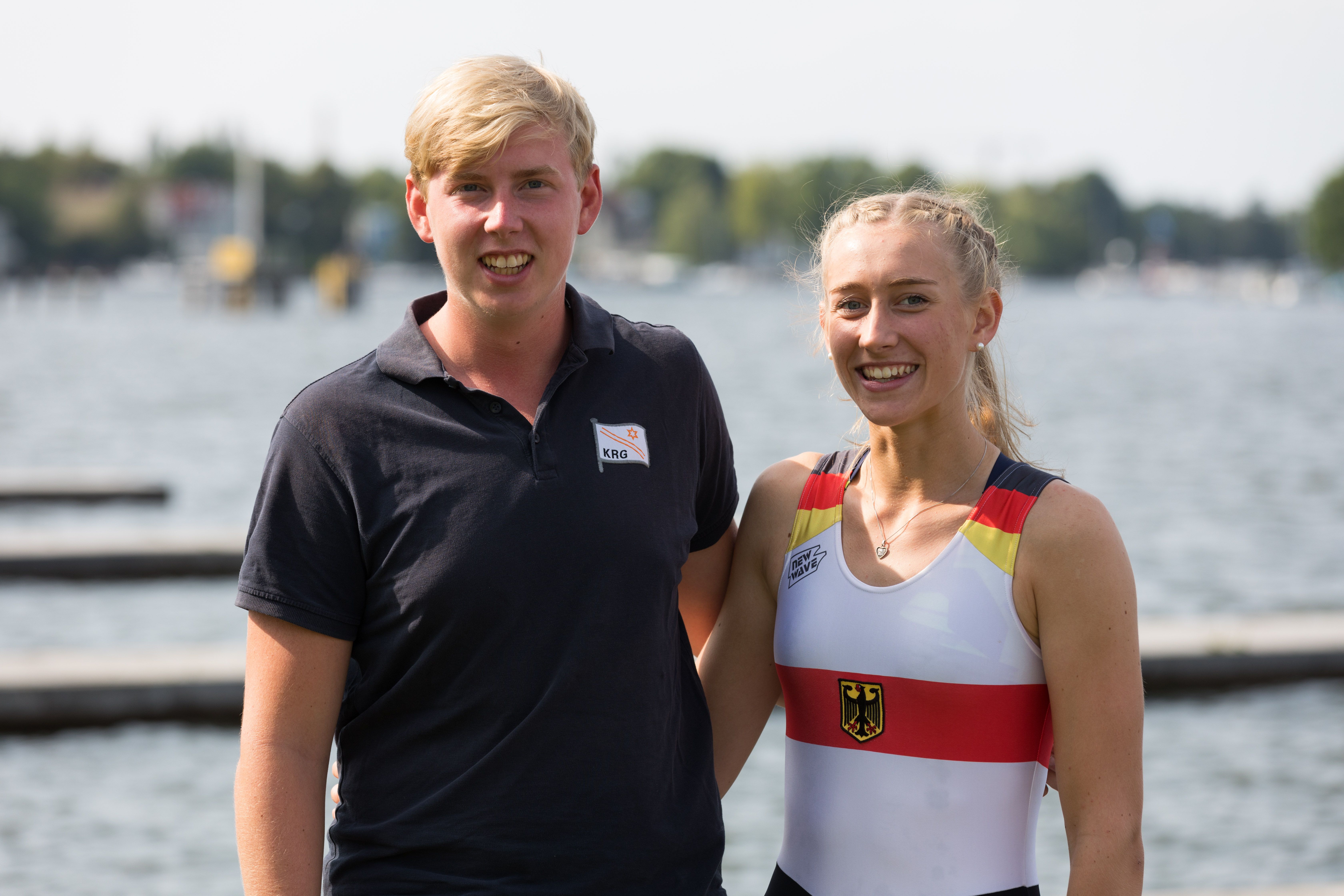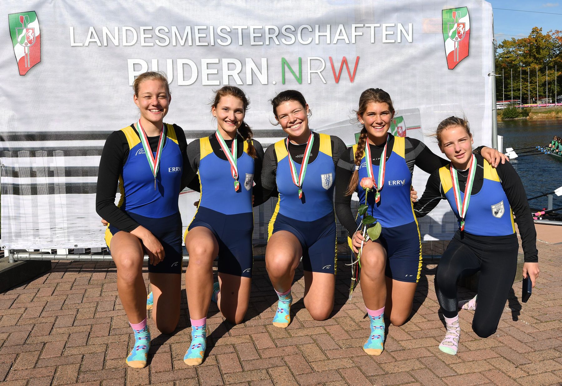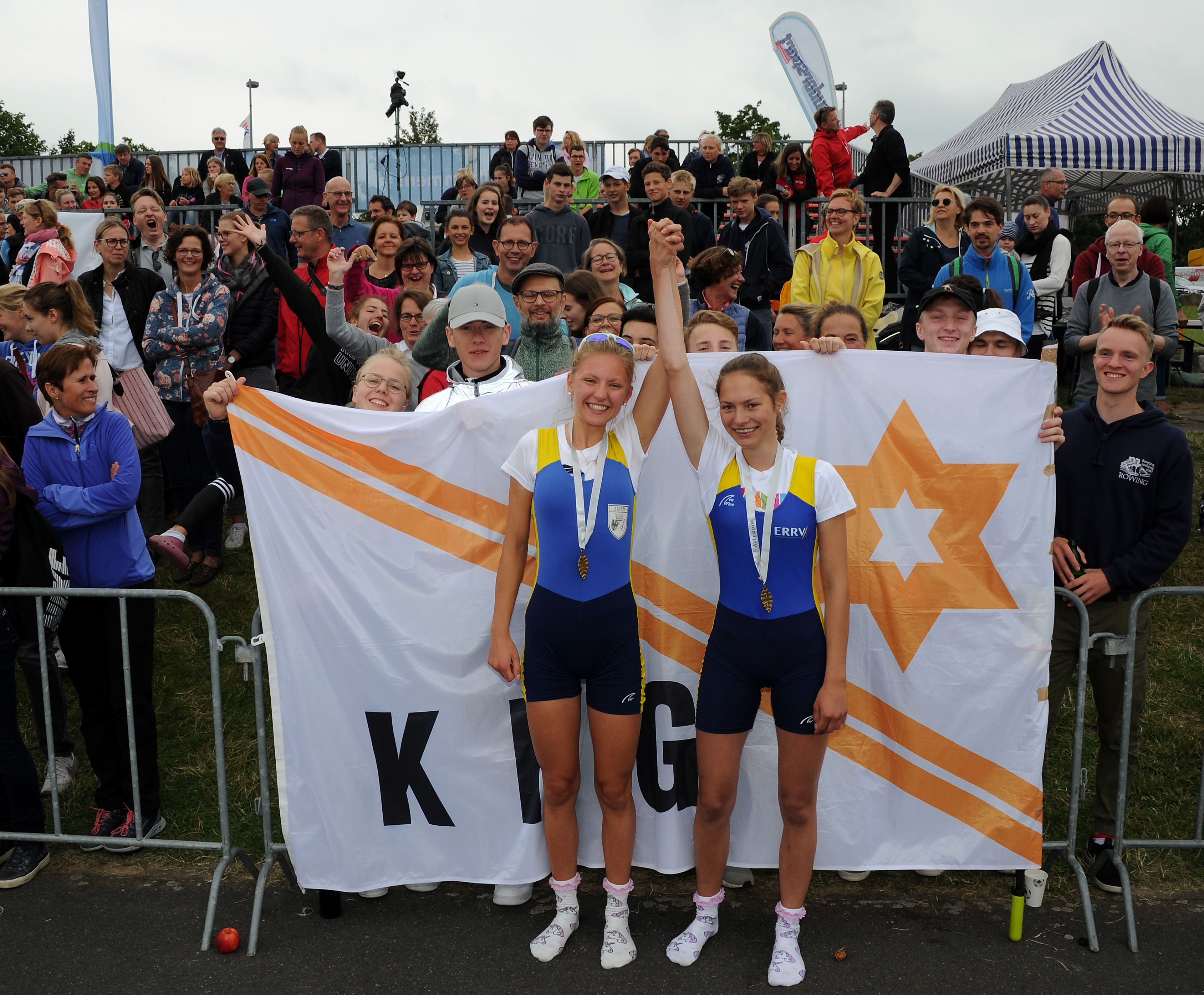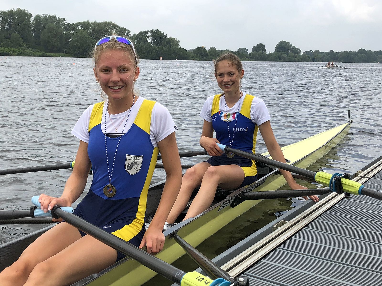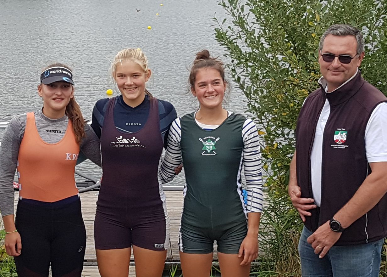 Lena Siekerkotte und Lehne Mührs waren mit drei Titeln die erfolgreichsten Ruderinnen der KRG. Lena setzte sogar noch einen drauf und gewann im Einer die Silbermedaille. Überhaupt waren die KRG-Athleten einmal mehr sehr erfolgreich. Nach umfangreichen Umbaumaßnahmen konnte auf der Wedau in Duisburg endlich wieder eine Regatta stattfinden. Das Wetter spielte auch mit, wobei es am Sonntag deutlich abkühlte aber trocken blieb. Lena Siekerkotte und Lehne Mührs gewannen am Samstag den Titel im Doppelzweier der 15/16 Jährigen. Am Sonntag waren sie auch im Doppelvierer gemeinsam mit Emma Achenbach, Antonia Galland (RaB) und Steuerfrau Emilia Gallinat (Steele) nicht zu schlagen. Das Sahnehäubchen setzten sie dann im abschließenden Mixed-Doppelvierer drauf, wo sie mit Yannik Sohns (Steele), Henning Käufer (ETuF) und KRG Steuermann Tim Garnjost ebenfalls als erstes Boot die Ziellinie überquerten.