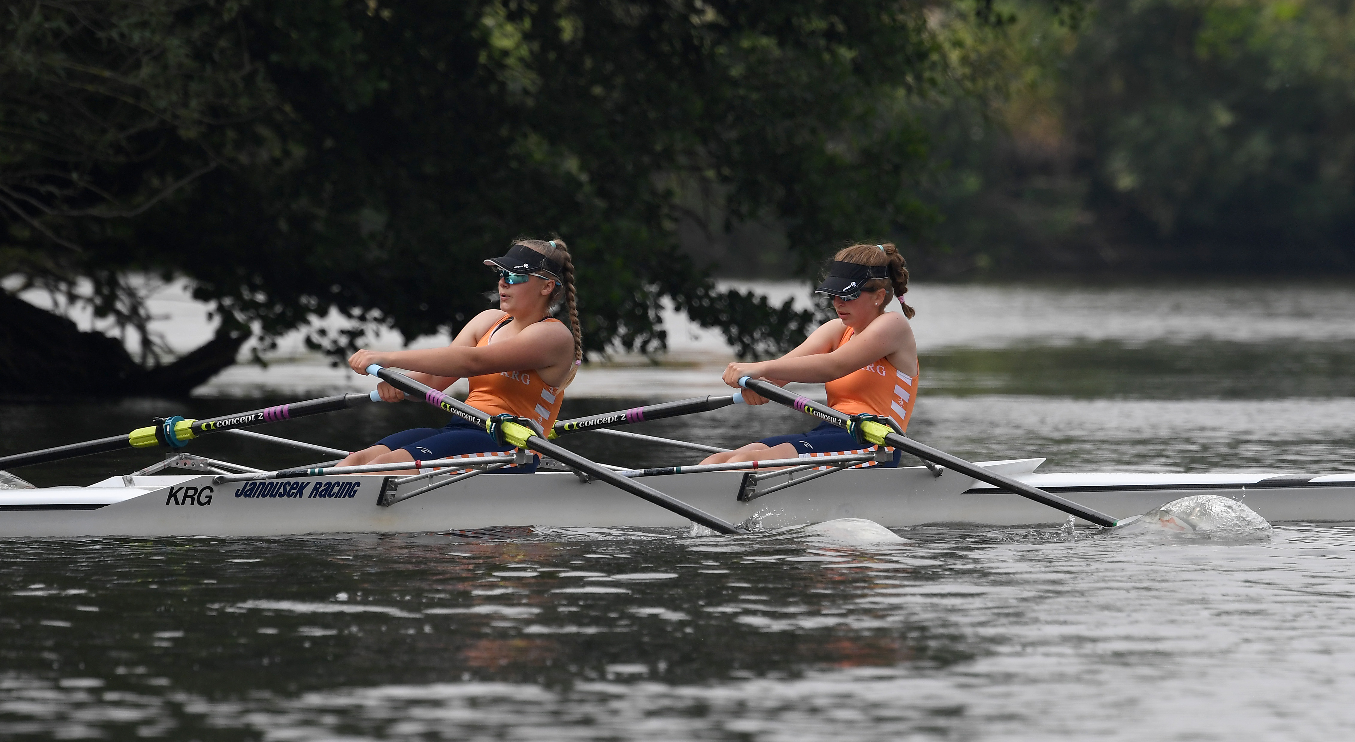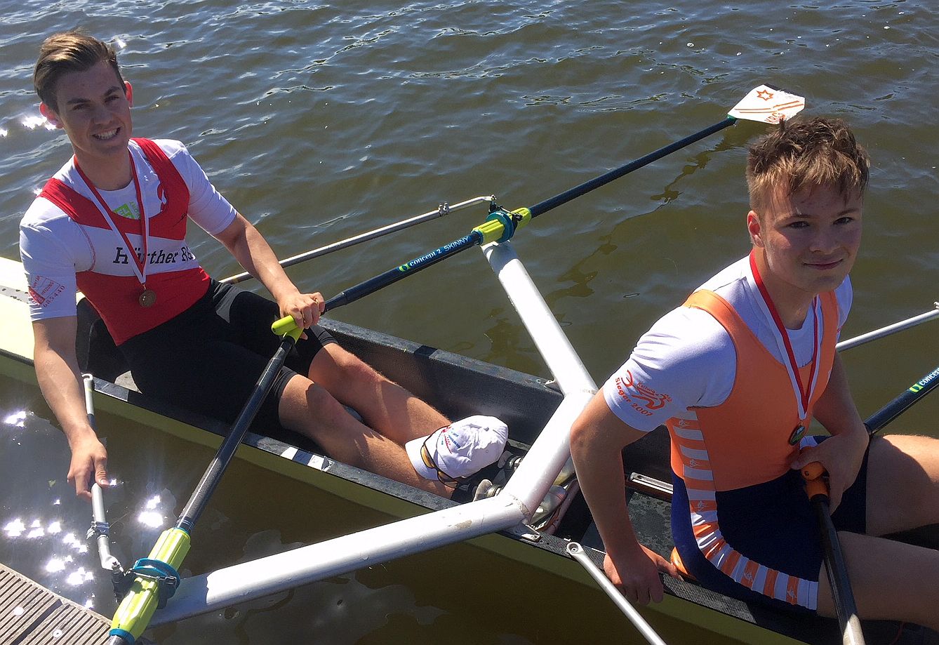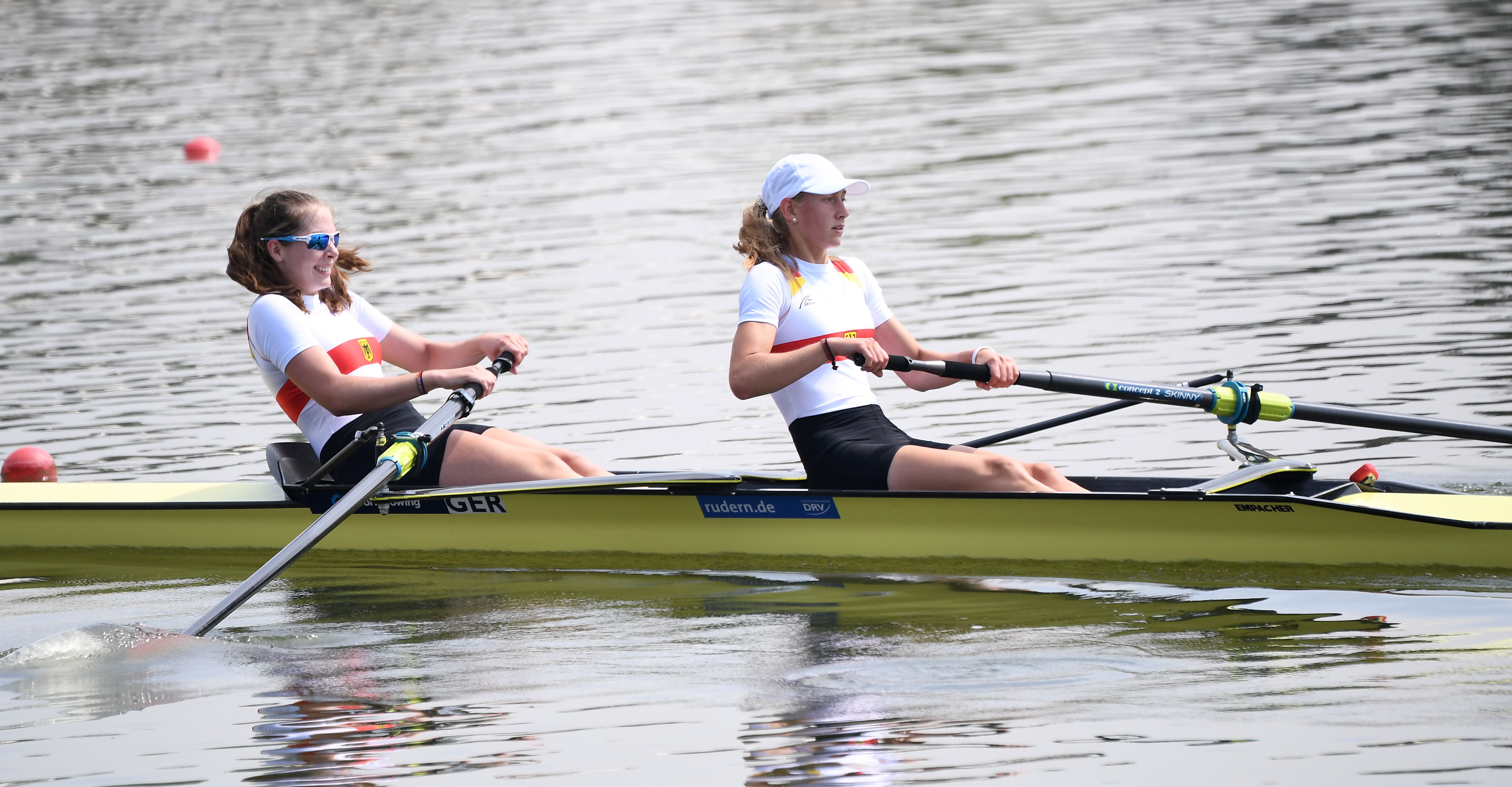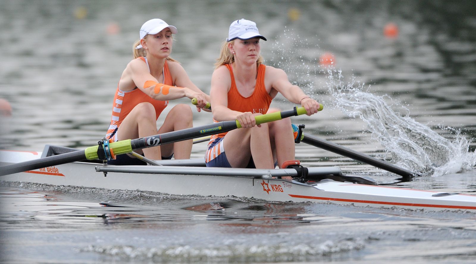 Lena Siekerkotte und Lehne Mührs waren mit drei Titeln die erfolgreichsten Ruderinnen der KRG. Lena setzte sogar noch einen drauf und gewann im Einer die Silbermedaille. Überhaupt waren die KRG-Athleten einmal mehr sehr erfolgreich. Nach umfangreichen Umbaumaßnahmen konnte auf der Wedau in Duisburg endlich wieder eine Regatta stattfinden. Das Wetter spielte auch mit, wobei es am Sonntag deutlich abkühlte aber trocken blieb. Lena Siekerkotte und Lehne Mührs gewannen am Samstag den Titel im Doppelzweier der 15/16 Jährigen. Am Sonntag waren sie auch im Doppelvierer gemeinsam mit Emma Achenbach, Antonia Galland (RaB) und Steuerfrau Emilia Gallinat (Steele) nicht zu schlagen. Das Sahnehäubchen setzten sie dann im abschließenden Mixed-Doppelvierer drauf, wo sie mit Yannik Sohns (Steele), Henning Käufer (ETuF) und KRG Steuermann Tim Garnjost ebenfalls als erstes Boot die Ziellinie überquerten.