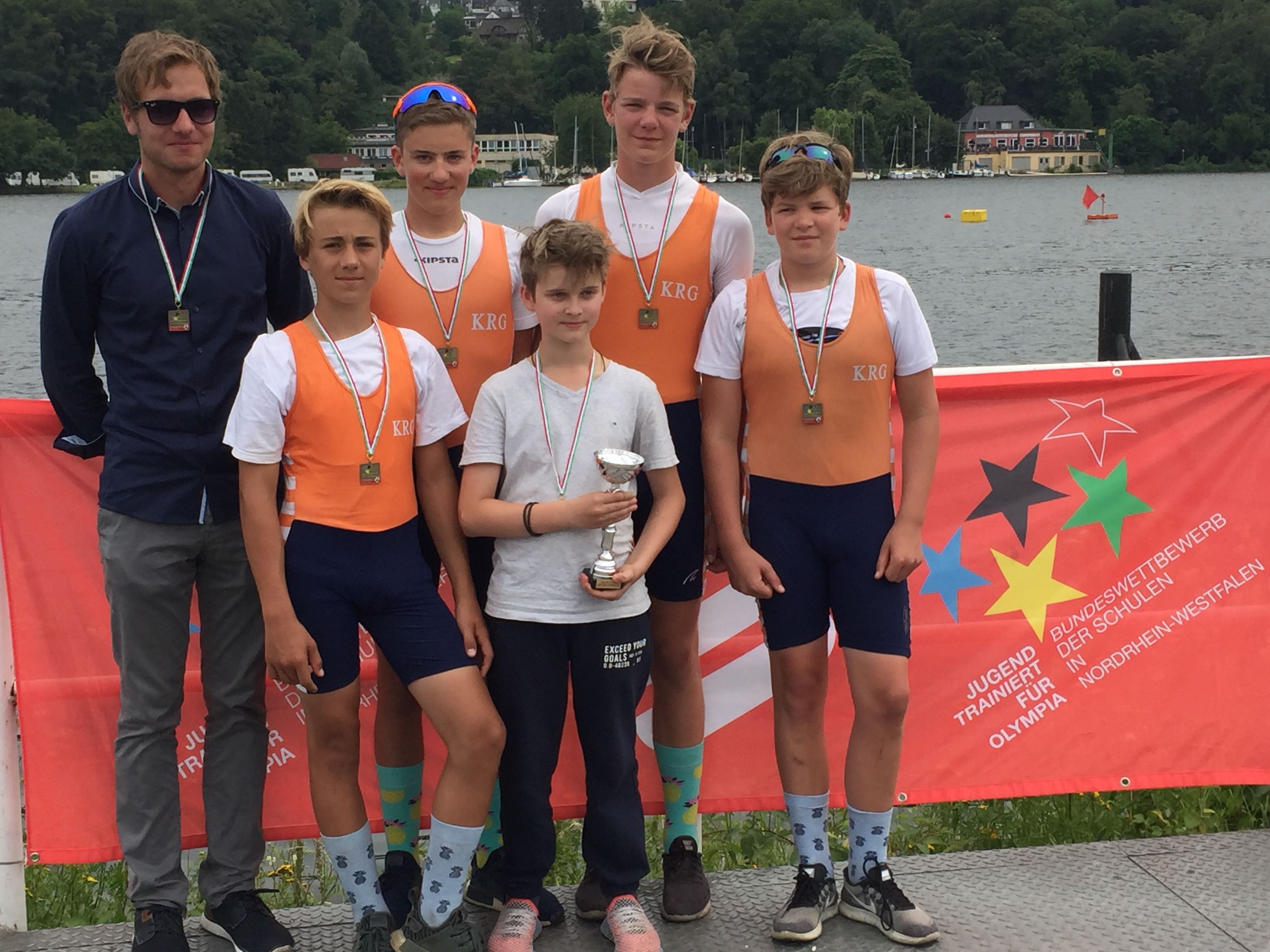 Dennoch war der Jubel bei den Aktiven, dem Trainer- und Betreuerstab sowie den Verantwortlichen vom THG und der KRG riesen groß. Die enge Kooperation zwischen Verein und Schule trägt weitere erfolgreiche Früchte, welches der einzige Bundessieg in der Sportart Rudern für NRW bei der größten Schulsportveranstaltung Europas "Jugend trainiert für Olympia" eindrucksvoll unter Beweis stellt.