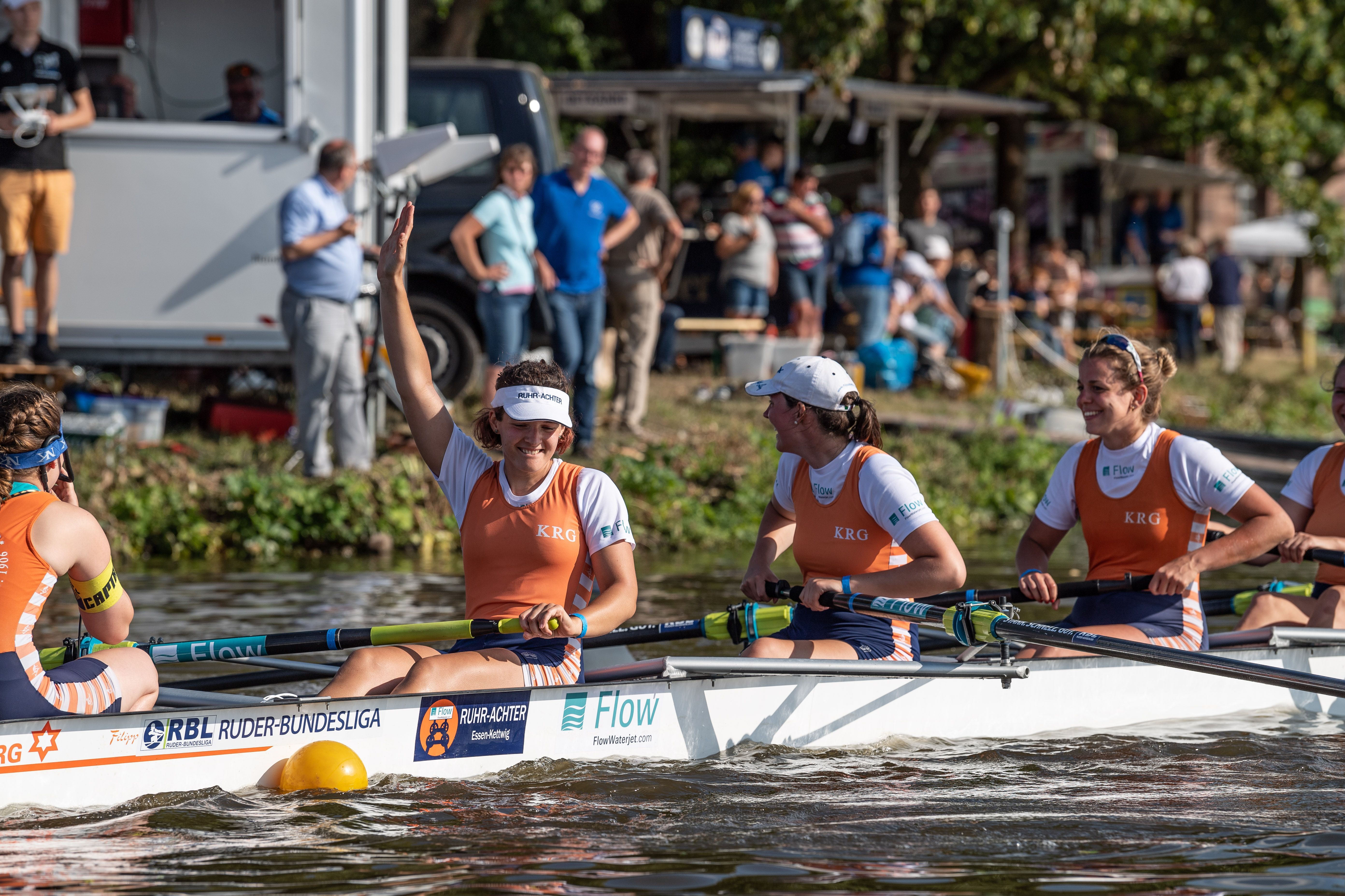 Was für eine überschwängliche Freude bei der KRG! Unser „FlowWaterjet Ruhr-Achter“ hat den fünften und letzten Renntag in der Ruder-Bundesliga im oberschwäbischen Bad Waldsee, rund 70 km südlich von Ulm, souverän gewonnen. Die Mädels feierten damit in ihrer dreijährigen Geschichte in der RBL nicht nur ihren ersten Renntagsieg, sie sicherten sich zudem noch die Bronzemedaille in der Gesamtwertung.