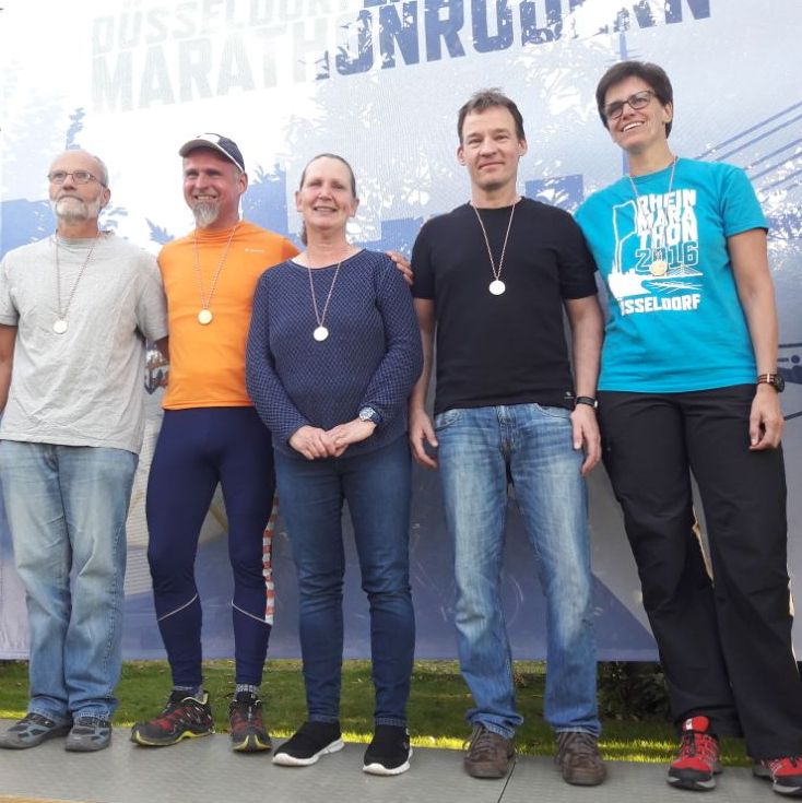 Parallel zu den Landesmeisterschaften nahmen unsere KRG´ler Antje Brückner und Detlef Müller am 47. Rheinmarathon des RC Germania Düsseldorf teil. Auf dem Rhein mussten 42 Kilometer bei Niedrigwasser und hochsommerlichen Temperaturen zurückgelegt werden. 13 Mannschaften hatten im Mixed-Doppelvierer D gemeldet. Nach etwa 10 Kilometern passierte das Missgeschick. Detlef Müller, der als „Rhein-Kenner“ die Steuerarbeit übernahm, hatte plötzlich das Ende der Steuerleine in der Hand. Ein Schäkel hatte sich geöffnet. Geschätzte vier Minuten, einige Nerven und Turnerei hat die Reparatur gekostet, bis die Fahrt weitergehen konnte. Umso größer die Überraschung und Freude bei Antje Brückner, Petra Schadock (Mühlheim) sowie Stefan Huster und Wolfdietrich Jacobs (Karlsruhe), dass es letztlich in 2:22:15 Stunden sogar recht deutlich zum Sieg gereicht hatte.