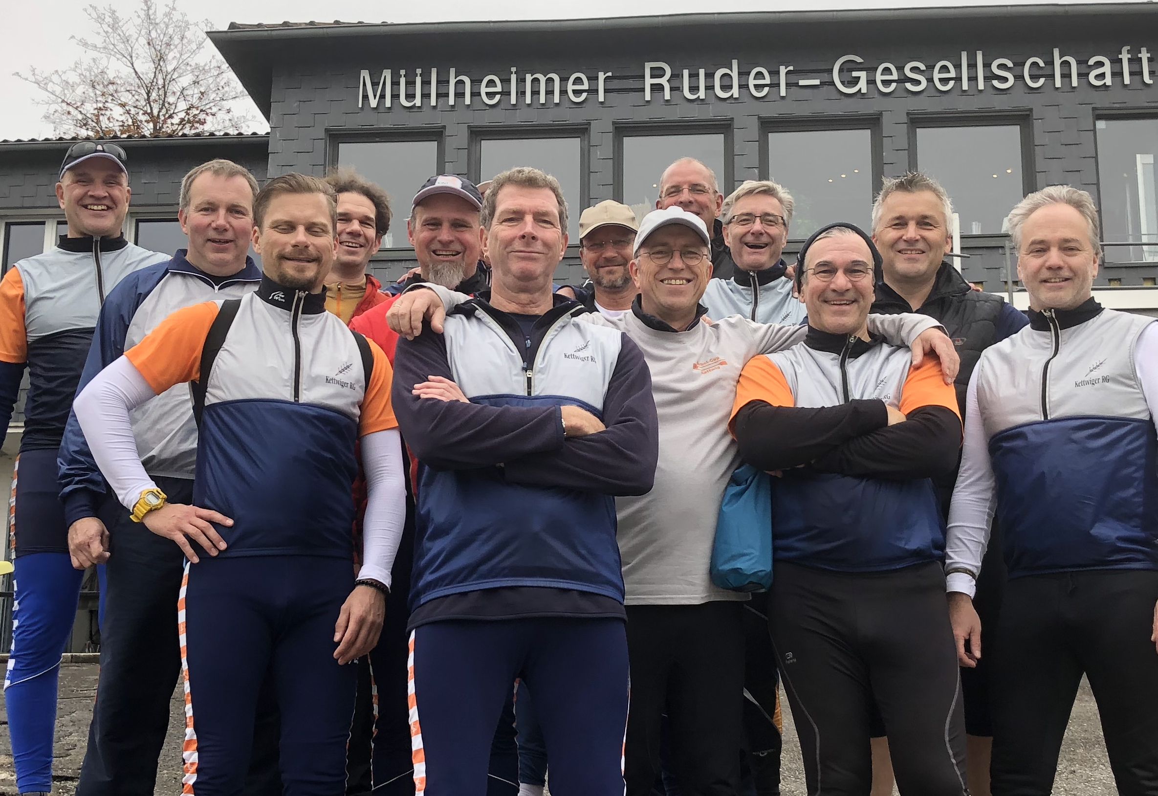 Auch bei den Herren gab es eine kurzfristige Änderung. Da die Umtrage und die Schleuse am Kettwiger Wehr geschlossen waren, startete die Tour direkt bei der Mülheimer Rudergesellschaft. Dies ersparte den Männlein das mühselige Umtragen und man war direkt am Ort des Geschehens. Nach einem Begrüßungsbier bei "Gaby" in der Gastronomie ging es aufs Wasser. Die MRG stellte uns dankenswerter Weise einen Achter und Vierer zur Verfügung. Zunächst ging es bis zur Autobahnbrücke, wo Thomas Burkhardt sich bewogen gefühlte eine Runde/Fass Bier zu spendieren. Von dort aus lautete das nächste Ziel Mülheimer Wasserbahnhof, wo der abwesende Dirk Schmidt seine Beziehungen aus dem fernen Sao Paulo spielen ließ und wir von der Kellnerin mit einer Runde Bier erwartet wurden. Zurück bei der MRG standen das Mittagessen sowie das ein oder andere Gedicht auf dem Programm.