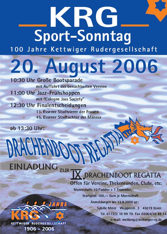 Bei den Mitgliedern des Festausschusses sieht man überall nur strahlende Gesichter. Ein gutes Zeichen, man ist sich sicher in Sachen Planung, Organisation und Durch-führung alles im Griff zu haben. Das Programm für den Jubiläumsempfang steht (s.u.). Mehr als 220 Gäste haben sich angemeldet. Auch für das Fest am Samstagabend scheint alles gerichtet zu sein. Schon jetzt kann man einen Blick auf die Speisekarte wagen. Alle benachbarten Vereine beteiligen sich an der Bootsparade am Sonntagmorgen. Mit den Tönen der "Cologne Jass Society" werden dann die Entscheidungen im Essener Stadt-Vierer und Achter erwartet, bevor das Drachen-bootrennen den Abschluss der hoffentlich gelungenen Jubiläumsfeierlichkeiten bietet.