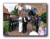 Standesamtlich hatte Britta Affeldt (geborene Holthaus) ihrem Thomas ja schon im vergangenen Jahr das JA-Wort gegeben. Damals wurde im kleinen Kreis gefeiert mit dem Versprechen, in diesem Sommer eine riesen Party mit der kirchlichen Trauung in Ratzeburg zu verbinden. Diese Versprechen hielten die Beiden und so waren fast 160 Gäste aus der gesamten Republik in die Ruderstadt von Karl Adam gereist, um diesen Feierlichkeiten beizuwohnen. Manfred und Uschi Scherrer, Sybille Meier, Boris und Christiane Orlowski, Annika Voelkel, Conny Mertin sowie Katrin Welzel vertraten die Farben der KRG. Wie es sich gehört, wurde ein Spalier aus eigens zu diesem Zweck mitgebrachten Skulls gebildet und der durch einen KRG-Skull versperrte Weg musste sich am späten Abend noch mit einem Brotmesser freigesägt werden. Diese Aufgaben hat das Brautpaar aber mit Bravour gelöst.