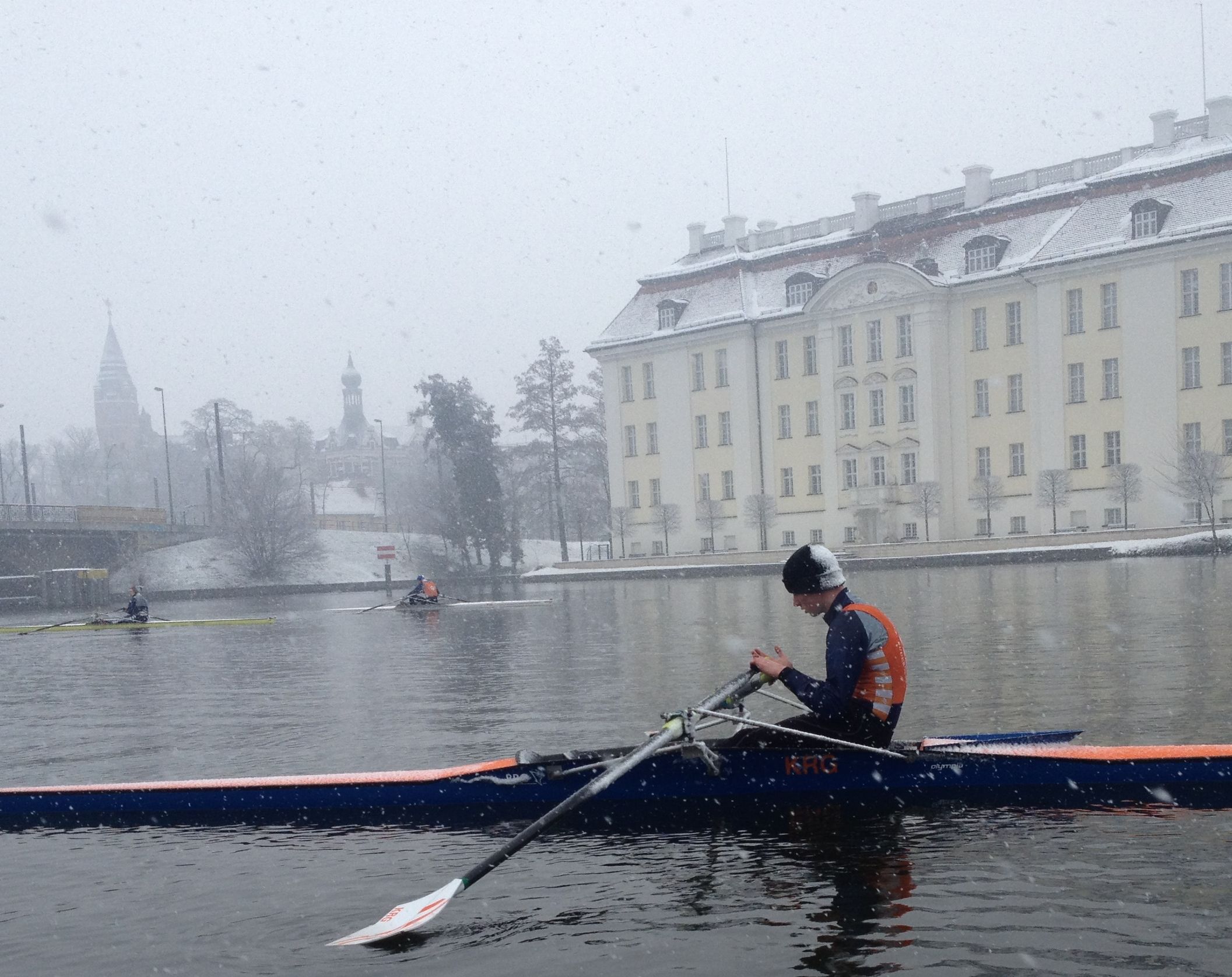 Mit einer Rekordbeteiligung von 19 KRG-Athleten, unseren beiden Trainern Thomas Kiesewetter und Boris Orlowski sowie unserer Sportvorsitzenden Sybille Meier, die einmal mehr organisatorische Hilfestellungen leistete, machte sich der ERRV- Tross mit insgesamt 116 Teilnehmern am frühren Gründonnerstag auf den Weg in die Bundeshauptstadt. Nach rund acht stunden Busfahrt "freuten" sich die Beteiligten über eine geschlossene Schneedecke aber eisfreies, offenes Wasser in Berlin. Heftige Schneefälle machten dann auch noch den Aktiven und Trainern in den ersten beiden Tagen zu schaffen. Dann beruhigte sich aber das Wetter und es wurden unzählige Trainingskilometer auf dem Wasser zurückgelegt.