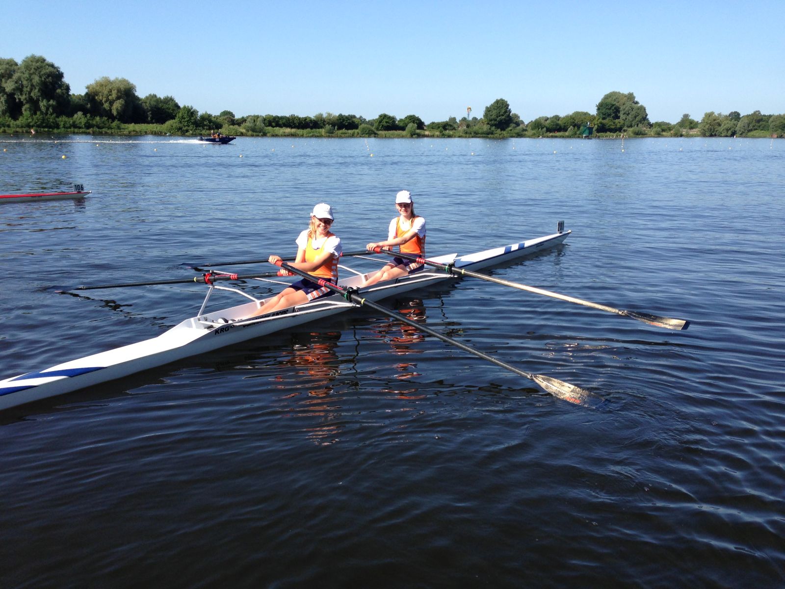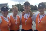 Bereits am frühen Samstagmorgen gab es die ersten Erfolgsmeldungen. Julia Barz und Dorothee Beckendorff sowie Lisa Quattelbaum und Leonie Neuhaus (EWRC) gewannen ihre Rennen im Zweier ohne Steuerfrau, wobei erst genanntes Boot die schnellere Zeit fuhr und damit als Sieger ausgewiesen wurde. Am Mittag dann feierte Karl Preuss seinen ersten Sieg in der Junirenklasse. Der 15-jährige Leichtgewichtsruderer siegte in einer ERRV-Renngemeinschaft im Doppelvierer. Erfreulich, dass sich unser KRG-Nachwuchsboot mit Marius Meier-Krüger, Niklas Meintrup, Lucas Treffkorn und Darius Drenker dahinter auf Rang zwei platzieren konnte.