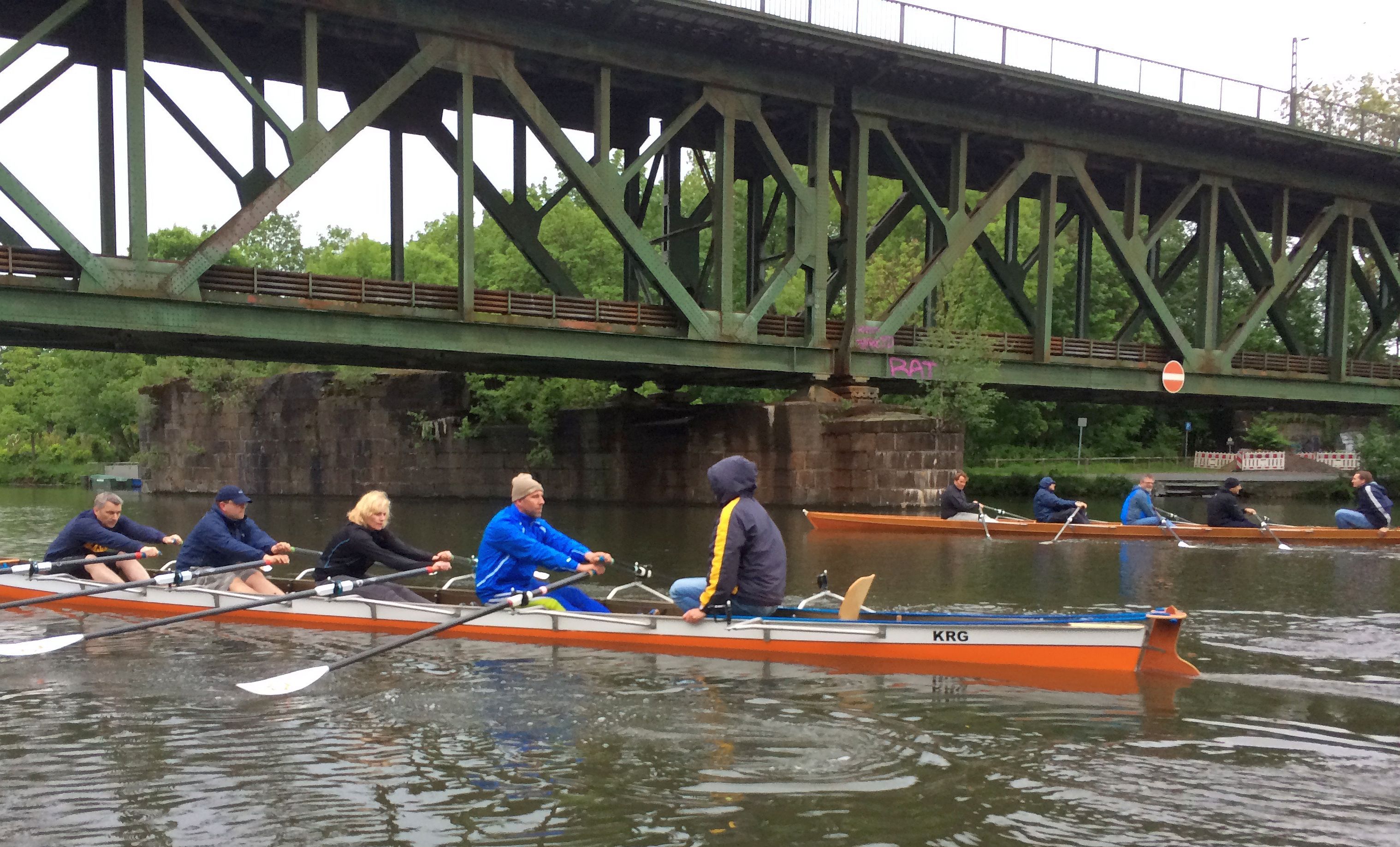 Die Herrentour hatte das Ziel Mülheim, wo bei der MRG zum Mittagessen angelegt wurde. Zunächst wurde aber in drei GIG-Vierern und einem GIG-Einer, die Aufgabe übernahm unser Wanderruderwart Michael Brockschmidt, von der KRG mit Umtragen am Kettwiger Wehr bis zum Mülheimer Wehr gerudert.